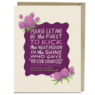 Card text reads: Please let me be the first to kick the next person in the shins who says "You look exhausted." Caregiving is hard. You're doing an amazing job.