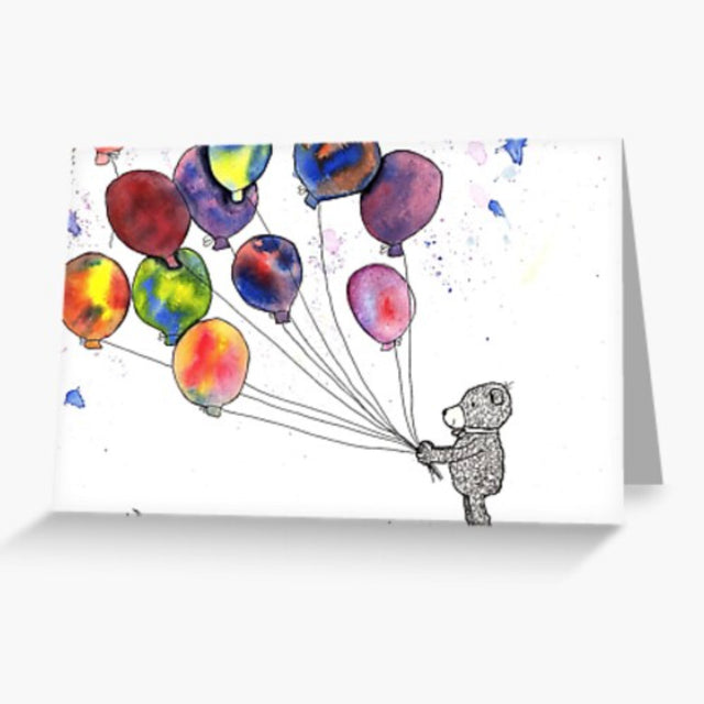 $5.00- Bear holding colorful balloons. Art by Sandra Connelly